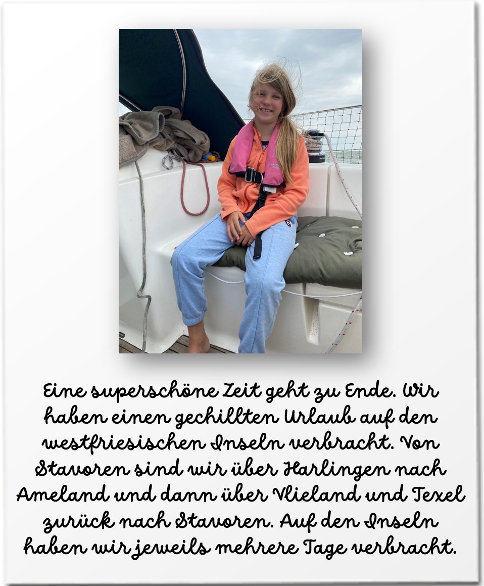 Wir sind rechtzeitig zurück in Stavoren, denn es wird in den kommenden Ragen jetzt richtig windig. Wir kommen leider nicht so rechtzeitig an, sodass wir vor der Johann Friso Schleuse noch einen Übernachtungsstopp einlegen müssen. Noch ein letzter Spaziergang auf dem Deich, bevor es wieder nach Hause geht. Wir hatten eine richtig schöne Zeit.