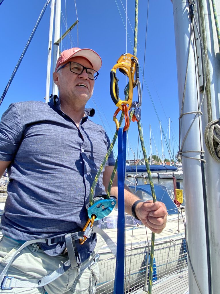 Die Decksbeleuchtung ist aufgefallen und das Leuchtmittel muss gewechselt werden. Mit einem Industrieklettergurt und einer Kletterausrüstung geht Stefan in den Mast. Da wir nur über manuell bedienbare Winschen verfügen und es trotz Winsch doch recht mühsam für Katja wäre Stefans 85 Kilo hochzuwinschen, nutzt Stefan von der Firma Petzl ein GriGri (ein halbautomatisches Sicherungsgerät), Handsteigklemme, eine Fussschlaufe, ein Abseilgerät und diverse Karabiner. So kommt Stefan nun auch alleine in den Mast. Es bedarf ein wenig Übung und ist auch viel bequemer im Klettergurt, als im Bootsmanstuhl zu sitzen. Die Fallen, an denen Stefan sich quasi hochzieht, wurden alle ausgetauscht und sind neu.